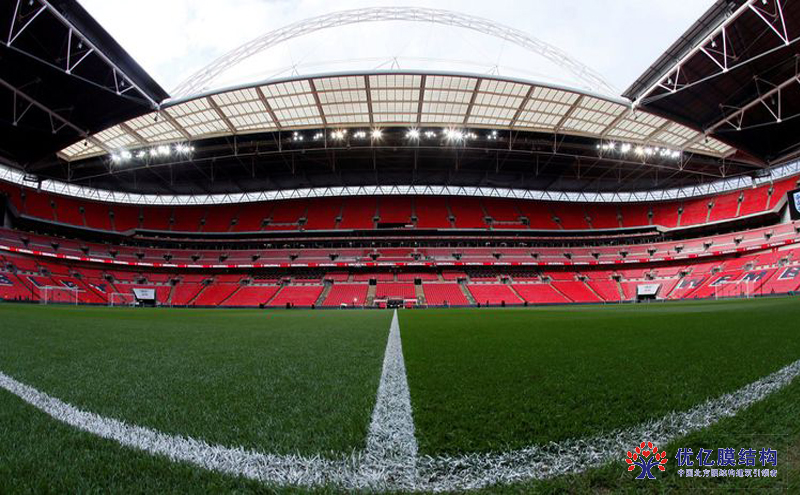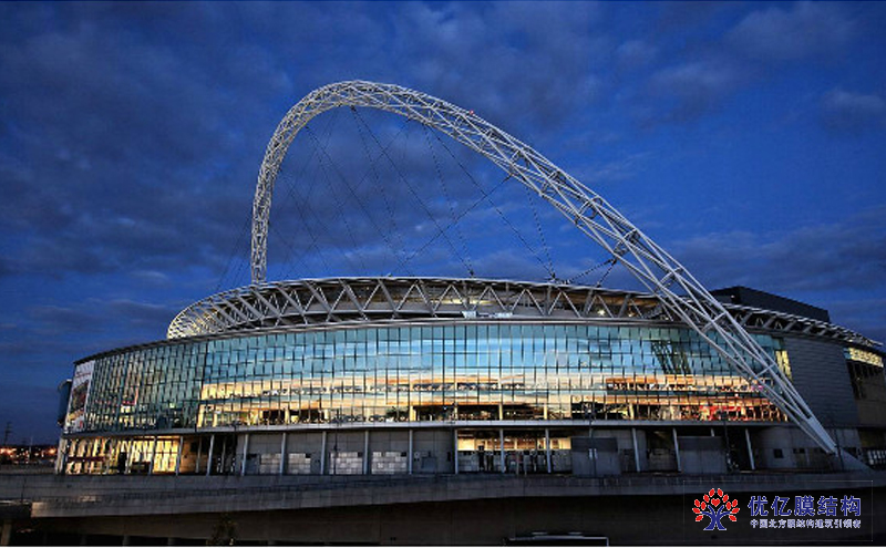 温布利球场 - 伦敦:作为英国最著名的体育场之一,温布利球场于2007年进行了重建,其中包括一个巨大的膜结构屋顶。这个屋顶由128个膜板和1,750根钢索组成,覆盖了球场的所有座位,并提供了良好的采光效果。
