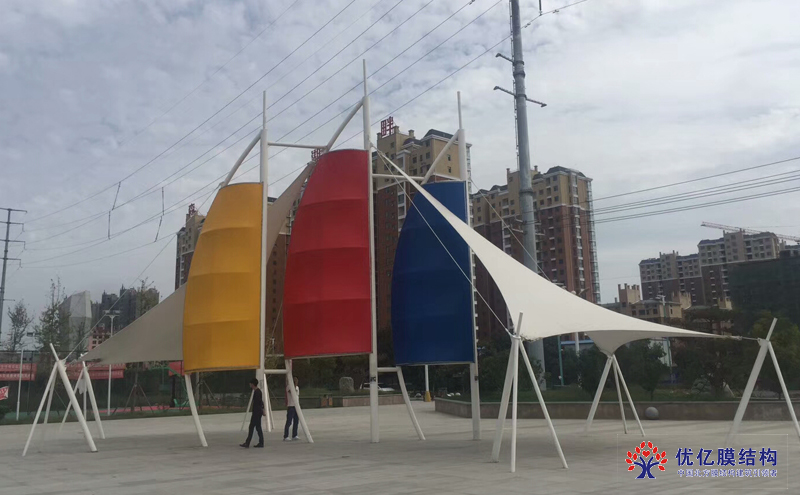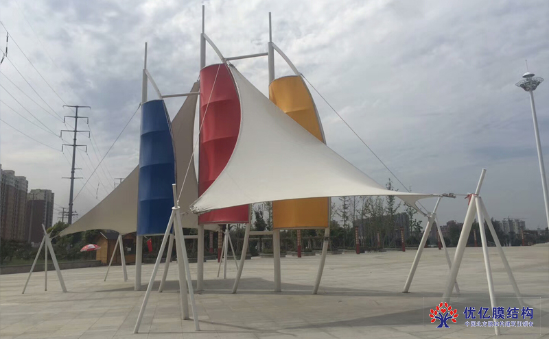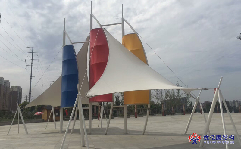 传统膜结构产品大多以白色为主这个景区的张拉膜采用了撞色设计膜布采用了红黄蓝白四种颜色
