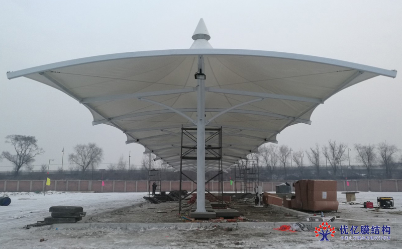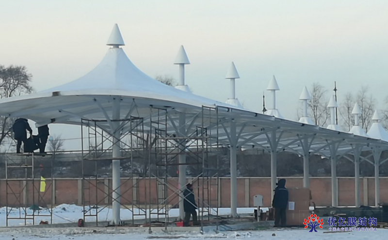 哈尔滨公交公司膜结构车棚工程是由优亿膜结构工程有限公司承建,公交公司膜结构车棚的施工过程中克服了大雪,时间短的困难,
