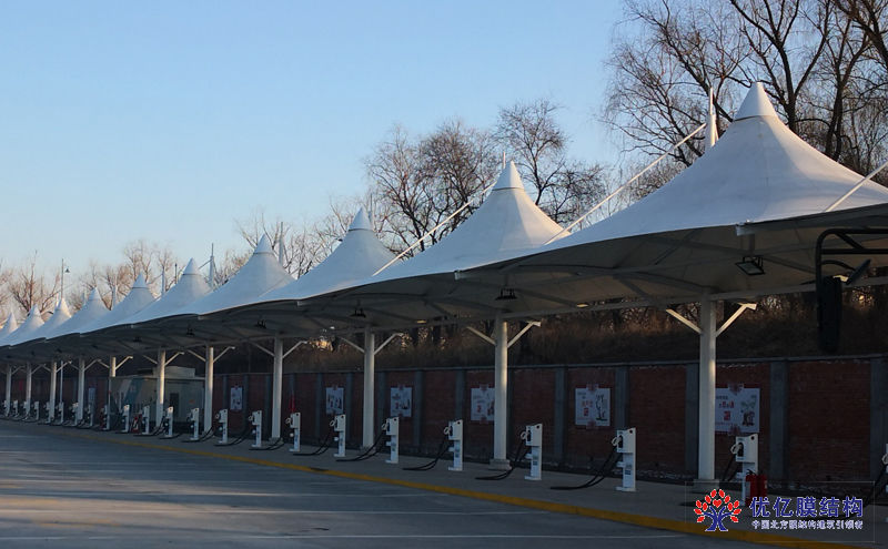 鲅鱼圈公交公司充电桩车棚工程是由优亿膜结构工程有限公司承建,公交公司膜结构车棚的施工过程中克服了大雪,时间短的困难,