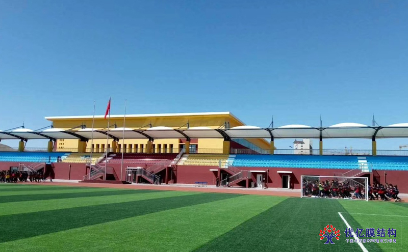 膜结构球场看台棚的覆盖材料通常采用聚脂薄膜、聚氯乙烯薄膜等耐候性材料。这些材料具有良好的防紫外线和耐磨性能,可以有效阻挡阳光,保护人们免受紫外线的伤害。