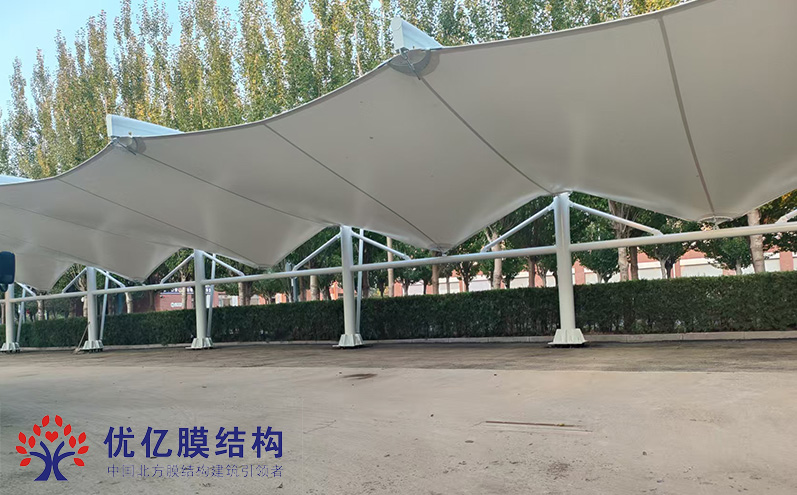 该工程位于盘锦理工大学院内长度32米宽度6米共计3处,其造型有别于传统膜结构车棚,采用张拉形式安装。